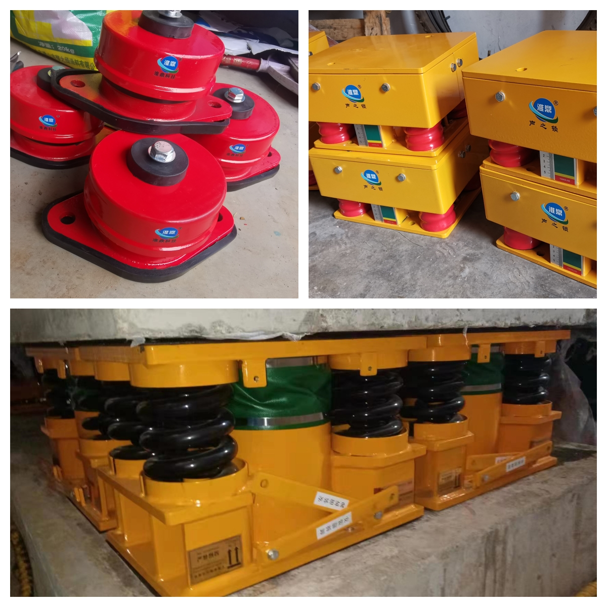 隔振器:頻率低于 6Hz的低頻靜音減振器。可選大撓度(不低于 50mm)低頻彈簧減振器配合天然膠墊安裝或者加裝空氣彈簧減振器。因是改造項目,彈簧減振器高度過大,不適合安裝,所以設(shè)計安裝超低頻靜音系列的空氣彈簧減振器、橡膠減震器、部分鋼彈簧減震器等其他減振產(chǎn)品配合使用。隔振降噪原理:空氣是振動和噪音的不良導(dǎo)體,用隔振手段把設(shè)備與樓板隔離開,由剛性連接轉(zhuǎn)換成軟性連接,中斷振動傳播途徑。 設(shè)計隔振效率:90%。 隔振效果:安裝后整個隔振體系的自振頻率達(dá)到 3Hz以下,低頻振動及因低頻振動產(chǎn)生的噪音基本消除。