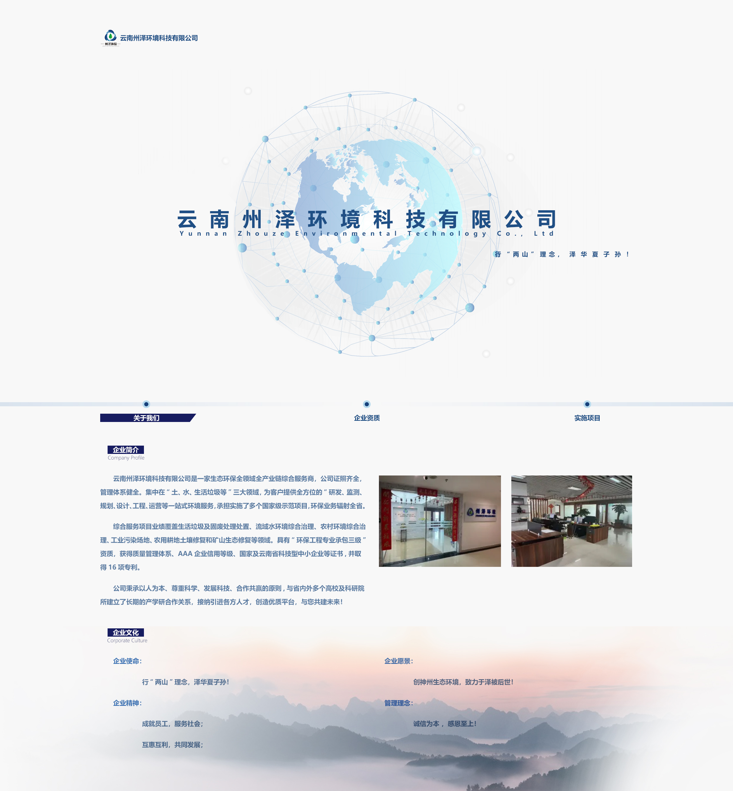 云南州澤環(huán)境科技有限公司是一家生態(tài)環(huán)保全領(lǐng)域全產(chǎn)業(yè)鏈綜合服務(wù)商,公司證照齊全,管理體系健全。集中在“土、水、生活垃圾等”三大領(lǐng)域,為客戶提供全方位的“研發(fā)、監(jiān)測、規(guī)劃、設(shè)計(jì)、工程、運(yùn)營等一站式環(huán)境服務(wù),承擔(dān)實(shí)施了多個(gè)國家級(jí)示范項(xiàng)目,環(huán)保業(yè)務(wù)輻射全省。