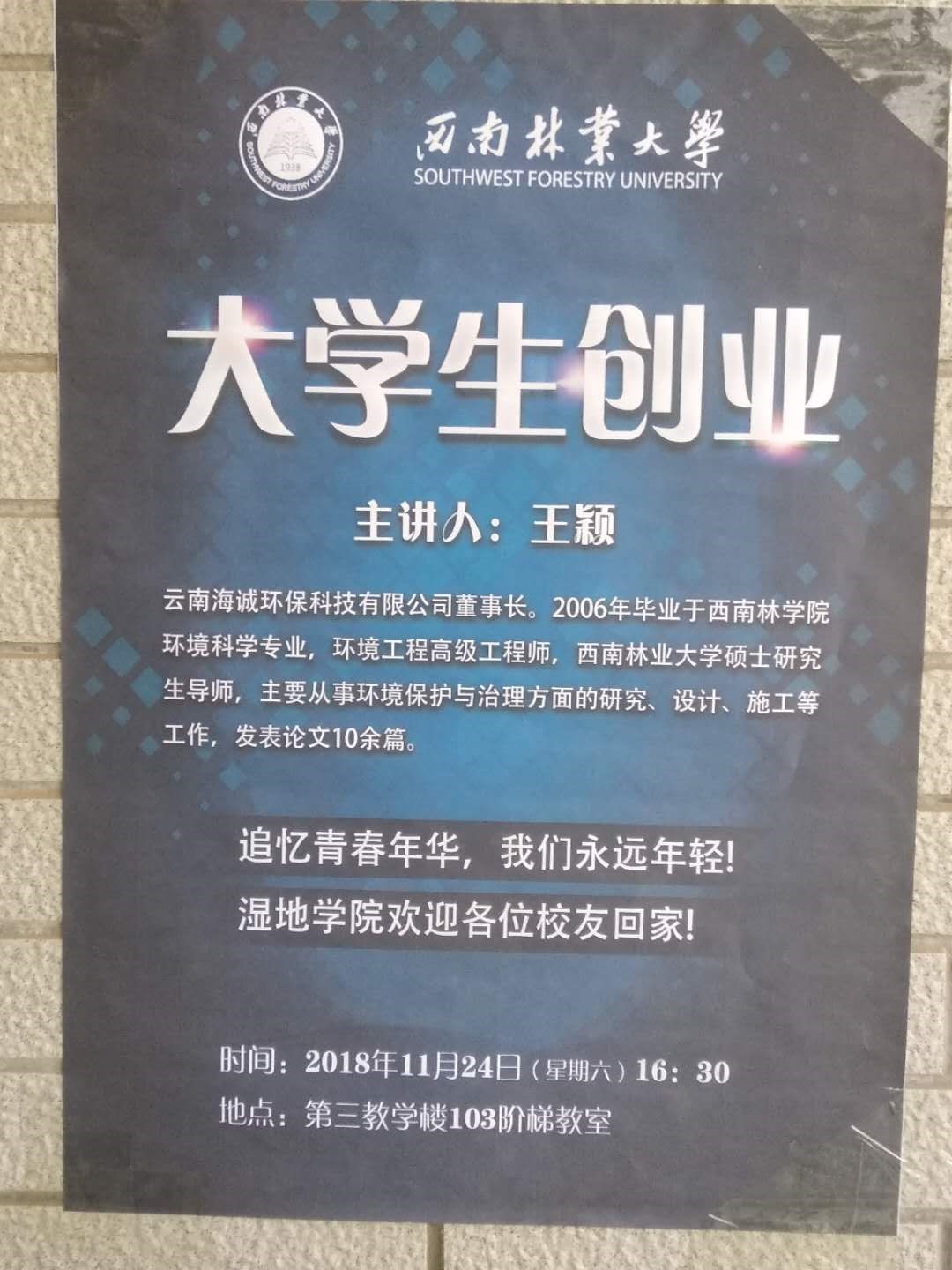 公司總經(jīng)理王穎被西南林業(yè)大學(xué)聘為碩士研究生導(dǎo)師暨受邀于西南林業(yè)大學(xué)80周年慶“大學(xué)生創(chuàng)業(yè)”活動主題的主講人